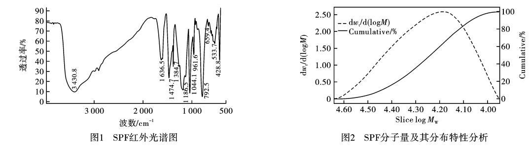 1)SPF紅外光譜分析(IR)SPF紅外光譜結果見圖1,3430.8cm?1為羥基伸縮振動峰,這不可能是醇羥基,而是酚羥基。3000cm附近有一個小峰,在1474.7cm是亞甲基變形振動峰,說明SPF中含有亞甲基。1636.5cm是苯環(huán)上的C=C鍵伸縮振動產(chǎn)生的特征吸收峰,在指紋區(qū)中的792.5cm?1區(qū)域中的譜帶是取代苯的1,2,6取代的特征吸收峰。1186.5cm?1和1044.1cm?1是由于S=O鍵伸縮振動產(chǎn)生的特征吸收峰,在700—500cm?1的連續(xù)吸收峰是S—O、S—S、C—S鍵伸縮振動產(chǎn)生吸收峰。SPF產(chǎn)物的分子中含有磺酸基、羥基和亞甲基等官能團。