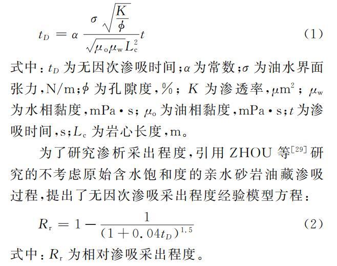 為研究黏度及界面張力對(duì)滲析采出程度的影響,引用MA等推導(dǎo)出的公式(1),式中同時(shí)考慮了親水系統(tǒng)和滲吸親油系統(tǒng)的無因次滲吸時(shí)間。