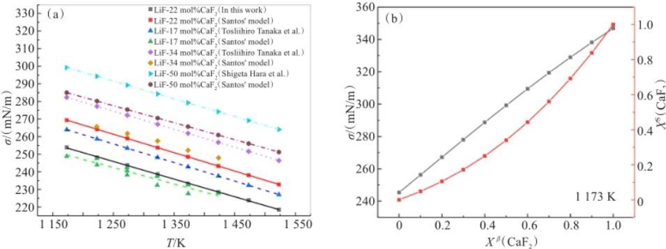 圖2 LiF-CaF2熔鹽體系表面張力(a)實(shí)驗(yàn)值與Santos模型計(jì)算值比較和(b)CaF2在表面相與體相含量關(guān)系