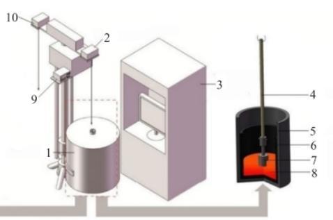 1.高溫爐;2.黏度儀;3.控制箱;4.剛玉套管;5.碳化硅坩堝;6.石墨坩堝;7.鎢制測(cè)頭;8.熔鹽;9.導(dǎo)電儀;10.天平儀。
