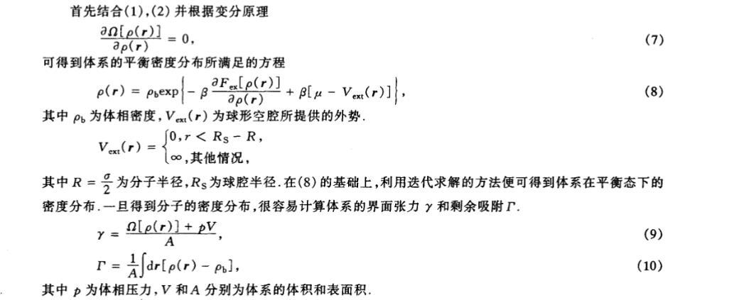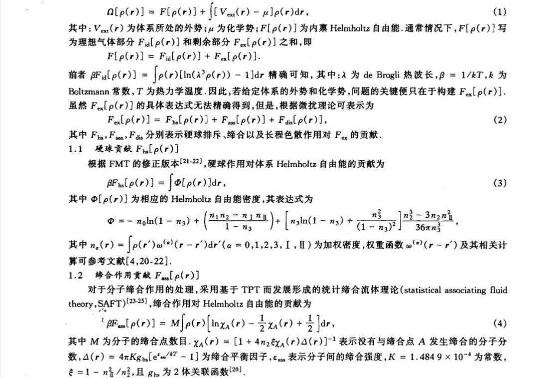 前者 Fid[ρ(r)]=kT∫ρ(r)[ln(Λ3ρ(r))?1]dr 精確可知,其中:Λ 為 de Broglie 熱波長,β=1/kT,k 為 Boltzmann 常數(shù),T 為熱力學(xué)溫度。因此,若給定體系的外勢和化學(xué)勢,問題的關(guān)鍵便只在于構(gòu)建 Fres[ρ(r)]。雖然 Fres[ρ(r)]的具體表達式無法精確得到,但是,根據(jù)微擾理論可表示為