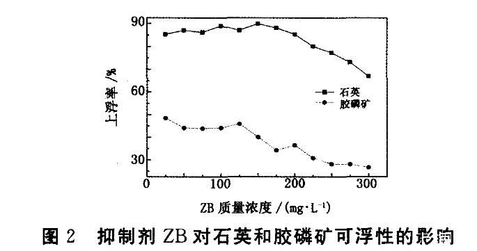 從圖2看出,ZB對膠磷礦和石英的抑制效果明顯,當ZB用量為150 mg/L時,兩者上浮率差異達到最佳,為54.90個百分點。與圖1對比可知,使用ZB做調(diào)整劑時,可在用量較低時得到更好的抑制效果。并對添加ZB后的礦漿pH值進行測定,當ZB用量達到150 mg/L時,礦漿pH為1.2左右;當ZB用量超過200 mg/L時,石英上浮率仍保持在70%以上,說明使用ZB不會造成石英上浮率明顯下降,更有利于膠磷礦和石英的有效分離。