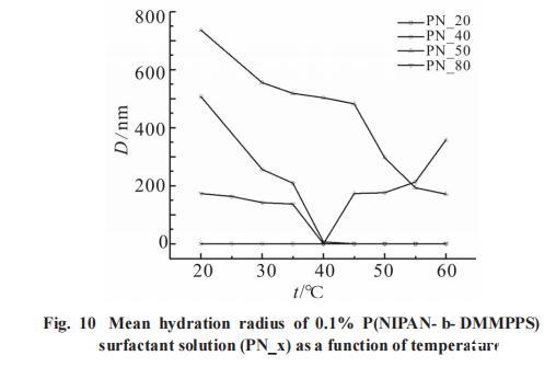從Fig.10可以觀察到,低溫條件下,PN_20的平均水合半徑大約為500nm,PN_50的水合半徑在750nm左右。此階段,這2種聚合物均形成了膠束結構,并從水溶液中析出。當溫度升高時,兩者的水合半徑均表現(xiàn)出明顯的減小趨勢,表明它們在水中的溶解度增加。特別地,對于PN_50而言,激光納米粒度儀的測量結果顯示,其水合半徑發(fā)生突變的溫度區(qū)間位于40℃至45℃之間。這一發(fā)現(xiàn)指出,PN_50在該溫度范圍內經(jīng)歷了熱敏性質的顯著變化,可能由于溫升引起的聚合物鏈構象改變或膠束結構的解離。相反,PN_40低溫時平均水合半徑接近于0,溶解性較好,而高溫時其水合半徑逐漸增大,接近400nm,從溶液中析出。其中PN_40所測得的LCST與透光率結果一致。隨著溫度升高,PN_20和PN_80分子在溶液中形成大的聚集體,激光粒度儀測定的是上清液的粒徑,因此粒徑變小,甚至觀察不到納米粒子。