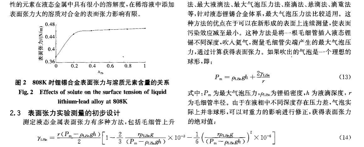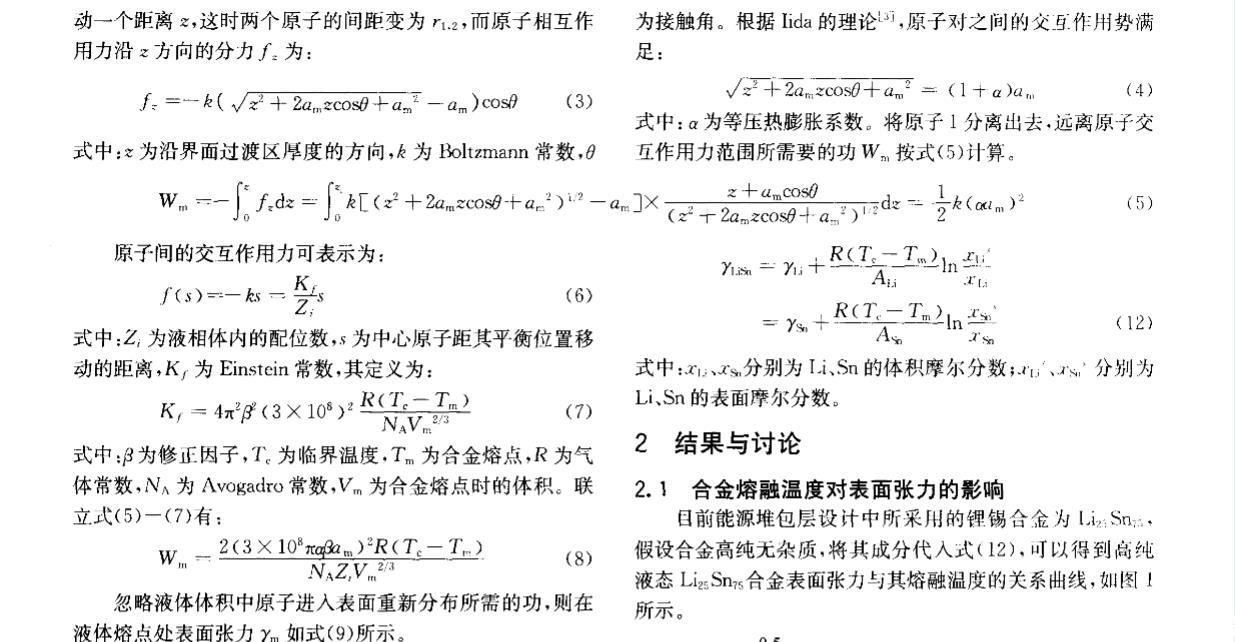 核能是公認現(xiàn)實可行的、可大規(guī)模替代常規(guī)能源的清潔能源。聚變堆或聚變_裂變混合堆液態(tài)金屬包層因其固有特性和優(yōu)勢,在國際上被普遍認為是未來電站最具發(fā)展?jié)摿Φ陌鼘釉O計方案之一。作為包層氚增殖劑和冷卻劑的鋰錫合金與鋰鉛合金一樣,具有廣闊的發(fā)展前景,其制備、純化、質量輸運等工藝難題正逐步得到重視。液態(tài)金屬的表面張力不僅是認識和理解冶煉過程最基本的物理量之一,而且是氣體吸收、氣泡形核、雜質生長等界面現(xiàn)象的控制因素。目前對液態(tài)金屬表面張力的研究多集中于金屬單質,合金的表面或界面行為在理論或實驗上都相當不足,主要是由于精確確定表面張力十分困難[2]。針對液態(tài)鋰錫合金這種新型的核材料,從基礎研究方面看,目前還沒有一種實驗方法能確定液體界面的結構,即兩個相之間過渡區(qū)域的結構,因此需要有一些假設或模型來滿足表面張力理論的研究。