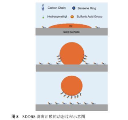 如圖8所示,SDDBS剝離油膜機理可從以下三個方面進行闡釋,首先SDDBS吸附在油水界面上降低了油水界面張力;其次,SDDBS的二羥基通過氫鍵作用強化了其與巖石表面吸附,磺酸基團富集于巖石表面使得巖石表面由親油轉變?yōu)閺娪H水,極大地增加了油滴在巖石表面接觸角,降低粘附功而使得油膜易于剝離;最后,由于SDDBS在油水界面和巖石表面同時吸附,增加剝離后油滴與巖石表面間的靜電斥力,使得剝離后油膜不易重新粘附壁面,實現(xiàn)高效剝離。