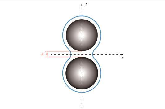 圖3說明了兩個相同球形顆粒之間的液橋結(jié)構(gòu),液橋力是由于顆粒間存在液體橋而產(chǎn)生的吸引力,主要由毛細(xì)力和表面張力組成。毛細(xì)力包括液橋內(nèi)外的壓力差和液體表面張力在接觸角處產(chǎn)生的吸引力,而表面張力在液橋表面產(chǎn)生環(huán)向力,將顆粒拉近。液橋高度用兩顆粒之間的分離距離a(μm)表示。