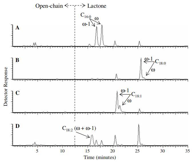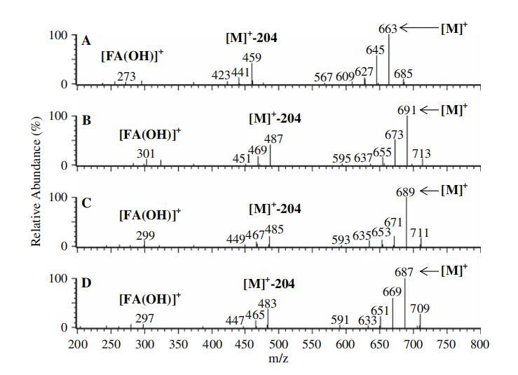 圖3正大氣壓化學(xué)電離(APCI)-來自圖2中每個TIC色譜圖基峰的質(zhì)譜圖。 圖2的TIC中的C16:0二乙?;敝瑑?nèi)酯(RT=16.7分鐘)、圖2的TIC中的C18:0二乙酰化槐脂內(nèi)酯(RT=25.2分鐘)、圖2c的TIC中的C18:1二乙?;敝瑑?nèi)酯(RT=20.7分鐘)和圖2d的TIC中的C18:2二乙?;敝瑑?nèi)酯(RT=15.8)。 ([M]+=質(zhì)子化分子離子;[M]+-204=質(zhì)子化分子離子-減去乙?;禾牵ㄙ|(zhì)量204);[FA(OH)]+=質(zhì)子化羥基脂肪酸)