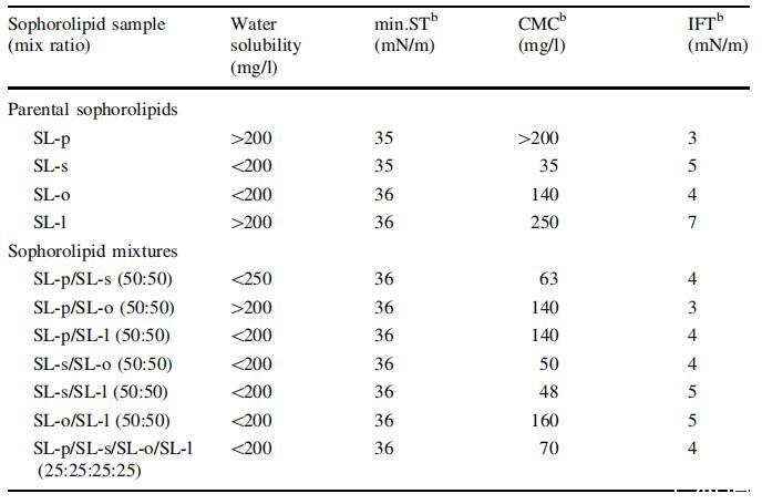 4個(gè)親代SLs中的每一個(gè)都產(chǎn)生了35–36 mN/m的可比最小ST,但CMC值明顯不同(表3)。 SL-p和SL-l的CMC值均大于200 mg/l,而SL-s和SL-o的CMC值分別為35 mg/l和140 mg/l。 IFT值范圍為3 mN/m(SL-p)至7 mN/m(SL-l)。 為了控制SLs的表面活性,以50:50的混合比制備混合物,并重新評(píng)估其性能。 各混合物的內(nèi)酯分布見表2。 經(jīng)分析,最小ST和IFT相對不變,但CMC值確實(shí)因SL混合物而異。 通過混合獲得了介于48 mg/l和140 mg/l之間的臨界膠束濃度。 有趣的是,CMC值最低的SL混合物都含有SL-s成分。 特別是SL-s的CMC值為35 mg/l; 即使是以25:25:25:25的比例包含所有4種親本SL的混合物,其CMC值(70 mg/l)也比不含SL-s成分的其他混合物低。 這些數(shù)據(jù)表明,SL-s對水的表面活性性能的影響更為顯著。 通過使用較少的SL-s,可以實(shí)現(xiàn)相等的最小ST和IFT。 性能控制和高產(chǎn)量將通過降低成本最終有助于SLs的工業(yè)應(yīng)用。 這些數(shù)據(jù)還指出,通過將不同的SLs混合在一起以獲得所需的性質(zhì),可以在一定程度上控制SLs的表面活性性質(zhì)。 雖然未達(dá)到表明這些SLs單獨(dú)具有優(yōu)越表面活性劑性能的最低標(biāo)準(zhǔn),但其性能可能足以允許其作為石化表面活性劑添加劑的使用量增加,以便在大量使用表面活性劑的應(yīng)用中盡量減少不利的環(huán)境影響。 SL-p和SL-l的CMC值均大于200 mg/l,而SL-s和SL-o的CMC值分別為35 mg/l和140 mg/l。IFT值范圍為3 mN/m(SL-p)至7 mN/m(SL-l)。為了控制SLs的表面活性,以50:50的混合比制備混合物,并重新評(píng)估其性能。各混合物的內(nèi)酯分布見表2。經(jīng)分析,最小ST和IFT相對不變,但CMC值確實(shí)因SL混合物而異。通過混合獲得了介于48 mg/l和140 mg/l之間的臨界膠束濃度。有趣的是,CMC值最低的SL混合物都含有SL-s成分。特別是SL-s的CMC值為35 mg/l;通過將SL-s與SL-p、SL-o和SL-l以50:50的比例混合,CMC值分別增加到63 mg/l、50 mg/l和48 mg/l。即使是以25:25:25:25的比例包含所有4種親本SL的混合物,其CMC值(70 mg/l)也比不含SL-s成分的其他混合物低。這些數(shù)據(jù)表明,SL-s對水的表面活性性能的影響更為顯著。通過使用較少的SL-s,可以實(shí)現(xiàn)相等的最小ST和IFT。性能控制和高產(chǎn)量將通過降低成本最終有助于SLs的工業(yè)應(yīng)用。這些數(shù)據(jù)還指出,通過將不同的SLs混合在一起以獲得所需的性質(zhì),可以在一定程度上控制SLs的表面活性性質(zhì)。雖然未達(dá)到表明這些SLs單獨(dú)具有優(yōu)越表面活性劑性能的最低標(biāo)準(zhǔn),但其性能可能足以允許其作為石化表面活性劑添加劑的使用量增加,以便在大量使用表面活性劑的應(yīng)用中盡量減少不利的環(huán)境影響。