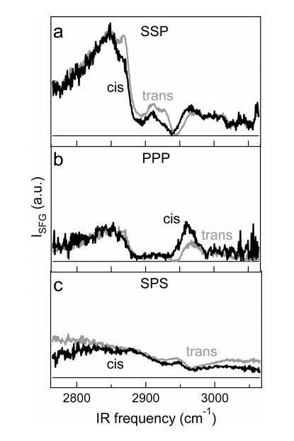 圖5.(a)在P的反式和順式狀態(tài)下,每分子65?2面積的DT Azo-5P純單層的標(biāo)準(zhǔn)化VSFG光譜與SSP極化分別為6和20 mN/m。(b)與a部分類似,但對于PPP極化。(c)反式和順式狀態(tài)的SPS極化中的SFG光譜( ~ 每分子78?2),壓力為2和15 mN/m。三個面板具有相同的垂直刻度。