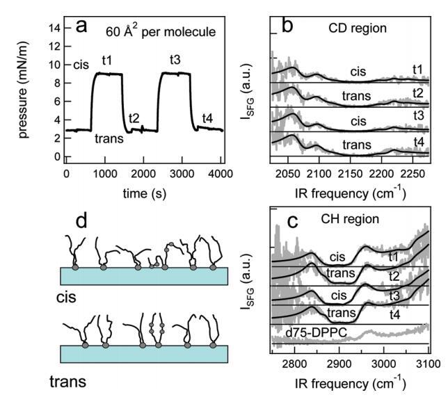 圖6。在脂質(zhì)/H2O界面處,DT Azo-5P/d75 DPPC的1:5混合物的結(jié)果,每個分子的面積為60?2。(a) 表面壓力與時間的關(guān)系。用370和450 nm光照射~100秒分別產(chǎn)生順式(高壓)和反式(低壓)狀態(tài)。壓力的微小劇烈波動是由于樣品高度的變化,以校正水的蒸發(fā)。(b) 相應(yīng)的VSFG光譜(灰色)以及CD區(qū)域的擬合。為了清晰起見,光譜已被抵消。(c) VSFG光譜(灰色)以及用于引導(dǎo)眼睛進(jìn)入CH區(qū)域的擬合。底部曲線顯示了在P時純d75 DPPC的光譜~ 40百萬/米。(d) 脂質(zhì)尾部方向的示意圖。光開關(guān)脂質(zhì)的偶氮苯部分用灰色圓圈表示。
