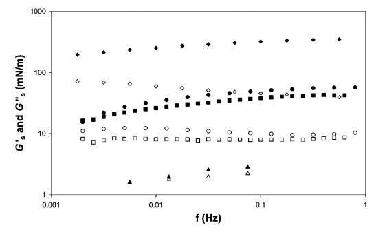 表面剪切流變學(xué)。 所有四個系統(tǒng)的表面剪切流變測量如圖11所示。 我們觀察到HFBII具有模量,比b-乳球蛋白和皂甙高一個數(shù)量級,這與早期結(jié)果一致。25值得一提的是,對于像奎拉葉皂甙這樣的表面活性劑,測得的表面剪切彈性非常高。 b-酪蛋白的表面剪切模量要低一個數(shù)量級。 關(guān)于頻率,我們發(fā)現(xiàn)與HFBII相比,皂甙和b-乳球蛋白對頻率的依賴性更強,尤其是在低頻率下。 此外,對于HFBII而言,Gs 00/Gs0的比率是最低的,即表面彈性對模量的貢獻比表面粘度大得多。 當(dāng)我們向交叉點外推時,我們預(yù)計HFBII和b-乳球蛋白或皂甙之間的弛豫時間會有一個數(shù)量級的差異。 對于b-酪蛋白,從0.01 Hz左右的數(shù)據(jù)可以很容易地觀察到交叉點。