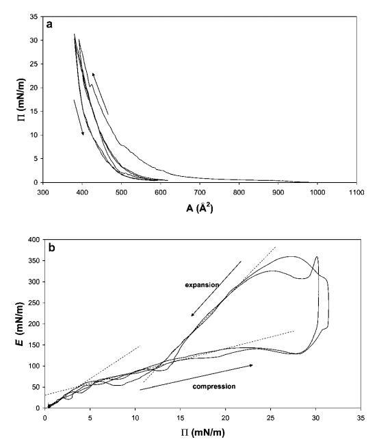 b-乳球蛋白。圖7顯示了b-乳球蛋白的壓縮等溫線。這條曲線遠沒有HFBII曲線陡峭,拐點更為明顯。盡管在屏障運動逆轉(zhuǎn)時觀察到滯后現(xiàn)象。E–P曲線的初始斜率為4.3,遠小于低P區(qū)的HFBII,表明b-lg分子在界面中相對較軟。觀察到E的平滑最大值為43 mN m-1,之后在進一步壓縮至28 mN m-1時,不再檢測到E的恢復(fù)。結(jié)果與早期的研究結(jié)果一致。40,41在屏障逆轉(zhuǎn)時,觀察到E的超調(diào),再次表明結(jié)構(gòu)無法適應(yīng)突然膨脹和斷裂。