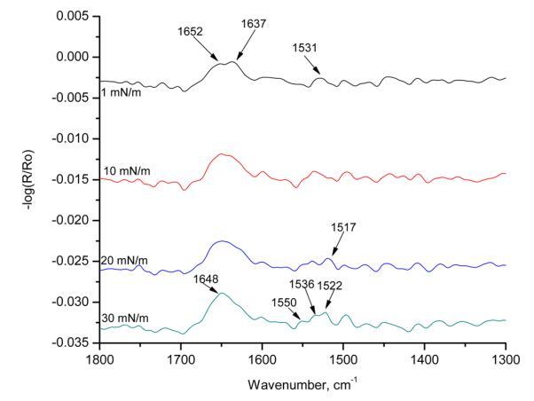 圖7顯示了HI-Langmuir單層在不同表面壓力下60°時(shí)的p極化。 這條帶子在1517厘米處 ? 1對(duì)應(yīng)于α-螺旋。 在1 mN/m的表面壓力下,有兩個(gè)可見帶:1652和1637 cm ? 1. 隨著表面壓力的增加,這兩個(gè)譜帶重疊并成為一個(gè)寬帶。 在30百萬(wàn)米 ? 1,波段可視為單個(gè)波段,頻率為1648厘米 ? 1. 這是對(duì)應(yīng)于α-螺旋的酰胺II區(qū)域的條帶。 下一個(gè)波段在1531厘米處以1 mN/m的寬帶出現(xiàn) ? 1. 隨著表面壓力的增加,它分成三個(gè)帶:1550、1536和1522厘米 ? 1. 在1550和1522厘米處的頻帶 ? 1分別對(duì)應(yīng)于α-螺旋和β-折疊中的酰胺II區(qū)域。 這種譜帶分裂表明,譜帶位于1531厘米處 ? 在較低的表面壓力下,1由α-螺旋和β-片組成。 在較高的表面壓力下,譜帶分離為離散的單個(gè)峰。 光譜中出現(xiàn)的其他峰是由于氨基酸和烷烴鏈的存在。 這條帶子長(zhǎng)1448厘米 ? 1對(duì)應(yīng)于C ? H CH2和CH3的剪切。 HI-Langmuir單分子膜的p-極化輻照度中存在所有三個(gè)表明α-螺旋的主譜帶。