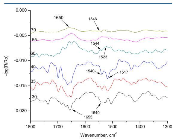 圖8顯示了HI-Langmuir單層在10 mN m處的p極化 ? 1在30、35、40、60、65和70°的六個(gè)不同角度。 在布儒斯特角之前,30、35和40 mN/m處的角未顯示出β片的特征帶。 所有三個(gè)角度顯示1655和1540厘米處的條紋 ? 1分別對(duì)應(yīng)于酰胺I和酰胺II吸收。 這條帶子在1517厘米處 ? 1,對(duì)應(yīng)于α-螺旋,在35°和40°中存在。 在布儒斯特角之后,所有60、65和70°的三個(gè)角都顯示出介于1650和1655之間的帶,這對(duì)應(yīng)于α-螺旋中的酰胺I吸收。 當(dāng)角度為60°時(shí),在1523 cm處可以看到峰值 ? 1,對(duì)應(yīng)于β片。 光譜中的其他譜帶都不是α-螺旋或β-片的特征。 光譜表明HI在空氣中以α-螺旋的形式存在 ? 水界面。 在10 mN m的恒定壓力下,隨著角度的增加 ? 1,發(fā)現(xiàn)光譜中的α-螺旋特征減少。