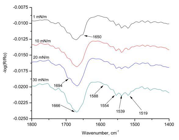 圖9顯示了在不同表面壓力下獲得的HI-Langmuir單層膜的s偏振輻照度。 在1 mN m的表面壓力下 ? 1,在1650 cm處存在一條帶 ? 1對(duì)應(yīng)于α-螺旋。 隨著表面壓力的增加,該條帶消失,并在1666 cm處并入該條帶 ? 1. 這條帶子長(zhǎng)1666厘米 ? 1包括β-轉(zhuǎn)角和α-螺旋。 這條帶子有1694厘米長(zhǎng) ? 1對(duì)應(yīng)于β片。 這條帶子在1519厘米處 ? 1也對(duì)應(yīng)于α-螺旋。 在入射角為60°的情況下,在1670處觀察到的能帶可歸屬于存在于β-轉(zhuǎn)角中的空間約束C=O部分,或者由于β-薄片中的躍遷偶極耦合而注意到峰值中的分裂。 當(dāng)改變表面壓力時(shí),最強(qiáng)烈的譜帶出現(xiàn)在1554和1539厘米處 ? 1,兩條帶均對(duì)應(yīng)于酰胺II區(qū)的α-螺旋。 所有三條主譜帶都表明HI-Langmuir單層的s極化輻照度中存在α-螺旋。