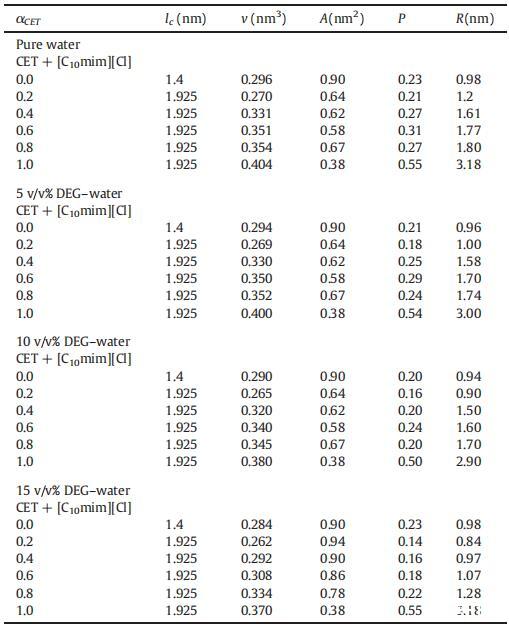 表5在純水中以及在T=298.15 K下存在不同體積百分比的DEG+水二元混合物時(shí),純CET、[C10min][Cl]和混合物CET+[C10min][Cl]的有效疏水鏈長度(lc)、疏水鏈體積(v)、極性頭基團(tuán)表面積(A)、填充參數(shù)(P)和半徑(R)的值。