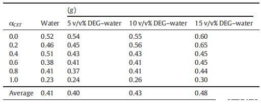 表4純CET、[C10min][Cl]和CET+[C10min][Cl]混合物的表面過剩(Γmax)、每分子最小面積(Amin)、吸附效率(pC20)和吸附自由能(ΔGad 0),作為純水中CET摩爾分?jǐn)?shù)α的函數(shù),并且在T=298.15K時(shí)存在不同體積百分比的二元DEG-水混合物。