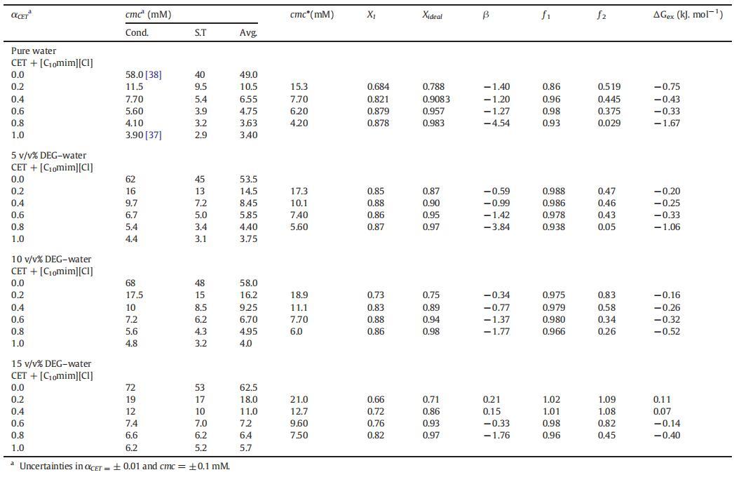表1(cmc)、平均值(cmc)、理想值(cmc*)、膠束組成(X1,Xideal)、相互作用參數(shù)(β)的值,混合物CET+[C10min][Cl]的活度系數(shù)(?1,?2)和混合過量自由能(ΔGex),作為純水中CET摩爾分?jǐn)?shù)(α)的函數(shù),以及在T=298.15 K時(shí)DEG-水二元混合物的不同體積百分比。