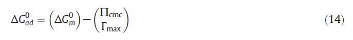 式(14)中的術(shù)語e∏cmcΓmaxT為我們提供了將單層表面壓力為零的兩親分子引入膠束所需的工作信息。ΔGm0和ΔGad 0的值均為負(fù)值,表明這兩個(gè)過程都是有利的,但是ΔGad 0的值比ΔGm0的值更為負(fù),這表明所有這些系統(tǒng)的吸附過程比膠束形成過程更為有利。