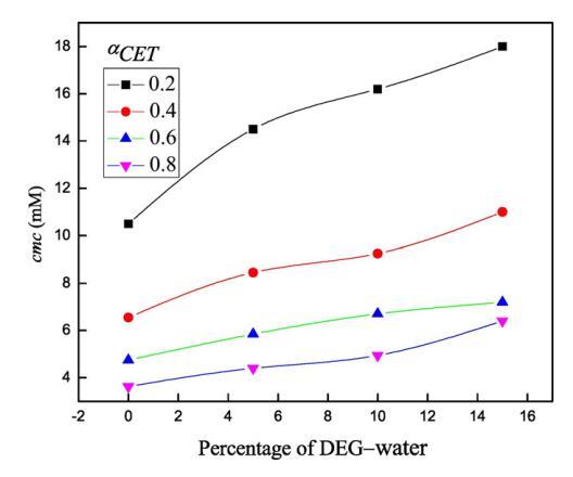 圖3。不同DEG-水混合物體積百分比下cmc的變化(a)αCET=0.2(■),(b)在298.15 K時(shí),αCET=0.4(),(c)αCET=0.6()和(d)αCET=0.8()。