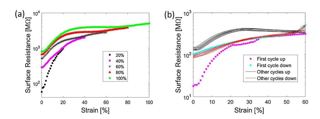 圖6a顯示了在20%和100%之間增加最大應(yīng)變的不同連續(xù)循環(huán)中,樣品表面電阻的變化。僅顯示拉伸循環(huán)。在前20%應(yīng)變期間,電阻增加約一個(gè)數(shù)量級(jí),表明MWCNT網(wǎng)絡(luò)內(nèi)的互連比降低。當(dāng)恢復(fù)到0%應(yīng)變時(shí),電阻沒(méi)有達(dá)到其初始值,而是增加了6倍。這突出了由于機(jī)械變形導(dǎo)致的電性能的不可逆變化。隨著最大施加應(yīng)變的增加,每個(gè)循環(huán)都會(huì)發(fā)生這種情況。然而,可以觀察到,在恢復(fù)到0%應(yīng)變后,表面電阻的增加在60%應(yīng)變以上不太明顯。值得注意的是,單層電極在100%單軸應(yīng)變下仍保持導(dǎo)電。