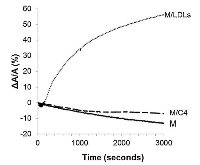圖4。單層(M)所覆蓋的界面的相對表面積隨時間的變化,該單層(M)以25 mN/M的速度壓縮,并在不含任何額外分子(-)的緩沖液上形成,(…)LDL(4.6 mg PC)和(-)脂質(zhì)體C4(含4.8 mg PC)??諝?緩沖界面處的溫度為34℃。