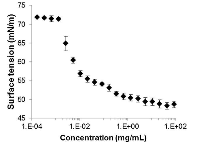 圖2。牛精漿溶液在空氣-水界面處的表面張力(±標準偏差),與提取物中所含蛋白質(zhì)的濃度有關(guān),并以對數(shù)標度表示(T=23.2℃±0.3℃,n=2,每個樣品重復(fù)4次)。