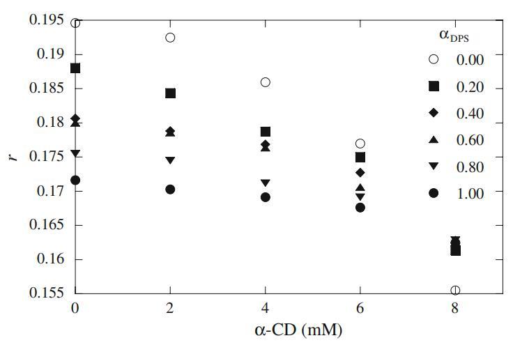 根據(jù)方程式15,我們計(jì)算了在不存在和存在α-CD的情況下當(dāng)前二元混合物的膠束組成(X1)。圖9顯示了混合膠束(X1)和體積摩爾分?jǐn)?shù)(α1)中表面活性劑的組成。從圖9可以得出結(jié)論,在αDPS=0.2時(shí),混合膠束中DPS的組成接近40%。存在α-CD時(shí)的X1值始終低于水的X1值。這種行為可能反映出α-CD通過(guò)降低其結(jié)合最強(qiáng)的表面活性劑的量來(lái)改變成分(見(jiàn)Ka值)。一般來(lái)說(shuō),CDs不與膠束相互作用,但CDs可能通過(guò)與溶液中的表面活性劑相互作用影響膠束的組成,從而改變膠束的平衡和組成。熒光各向異性為了研究混合膠束中兩種不同組分的行為,我們還使用RB作為熒光探針進(jìn)行了偏振熒光測(cè)量。這種探針在膠束介質(zhì)中已經(jīng)得到了很好的表征[33]。探針熒光發(fā)射的去極化程度是其激發(fā)態(tài)壽命期間旋轉(zhuǎn)擴(kuò)散的度量。熒光各向異性(r)通過(guò)Perrin方程與探針周?chē)恼扯认嚓P(guān),如下[34]: