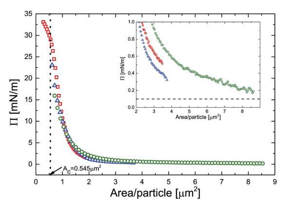 壓力-面積等溫線是通過在Langmuir槽上對擴(kuò)散單分子膜進(jìn)行3組不同實(shí)驗(yàn)得到的。這些等溫線中的面積坐標(biāo)根據(jù)吸附在界面上的顆粒數(shù)量進(jìn)行縮放。如圖1所示,所有曲線都折疊到一個(gè)圖上。在增加壓縮時(shí),壓力最初略有變化,但低于2 mm2/顆粒時(shí),壓力急劇增加。曲線的斜率首先增加,但在約27 mN m-1處達(dá)到最大值,在此有一個(gè)拐點(diǎn),然后是一個(gè)稍弱的斜率。如圖1中的虛線所示,對應(yīng)于該拐點(diǎn)的每粒子面積(Ac)值為0.545 mm2。假設(shè)粒子緊密堆積,這對應(yīng)于~835 nm的粒子間距離,遠(yuǎn)大于在本體溶液中測量的粒子流體動力學(xué)直徑(590 nm),表明粒子確實(shí)發(fā)生了實(shí)質(zhì)性變形。如圖1的插圖所示,0.5 mN m-1級的有限表面壓力(即遠(yuǎn)高于我們的檢測極限0.1 mN m-1)實(shí)際上已經(jīng)可以在約4 mm2的每粒子面積上測量。插圖還表明,在兩個(gè)不同的朗繆爾槽上進(jìn)行的不同實(shí)驗(yàn)之間,P的絕對值在0.3 mN m-1范圍內(nèi)可重復(fù)。