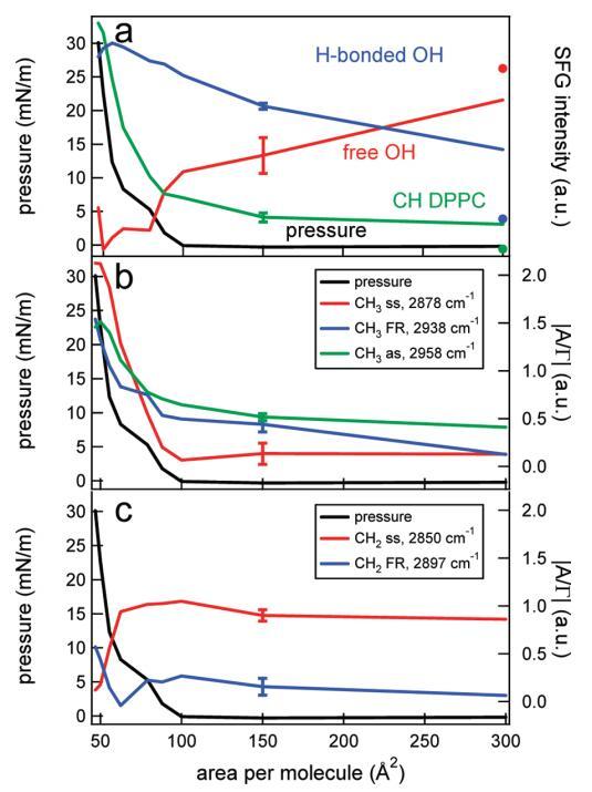 圖6。(a)DPPC的CH信號(綠色)、Hbonded OH信號(藍(lán)色)和游離OH信號(紅色)的表面壓力(黑色,左軸)和積分SFG強(qiáng)度(右軸)作為每個分子面積的函數(shù)。數(shù)據(jù)點是通過整合特定光譜區(qū)域獲得的,該區(qū)域由圖5的光譜中的彩色方塊標(biāo)記。純水層的CH、OH和游離OH面積(在表面活性劑攤鋪前測量)分別表示為綠色、藍(lán)色和紅色圓點。為清晰起見,集成SFG信號已被標(biāo)準(zhǔn)化,并且彼此略微偏移。(b)表面壓力(黑色,左軸)和不同CH3共振(右軸)的絕對振幅/帶寬比(|A/Γ|),通過使用洛倫茲線型模型擬合圖5中的數(shù)據(jù)獲得。(c)和b一樣,但是對于CH2共振。典型誤差條如圖所示。