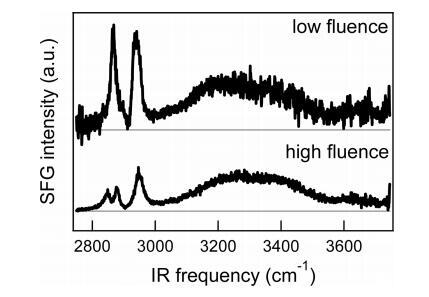 高密度下不同的SFG光譜是激光注量的函數(shù)。通過比較在不同通量下測得的高壓(高脂密度)下脂層的兩個SFG光譜(圖7),在CH峰處觀察到差異,而水帶大致相同。在相對較高的通量下(底部面板)~10 mJ/cm2,CH2峰值為2850 cm?1仍然清晰可見,而該峰值在低通量的頂部面板中不存在(~1.5 mJ/cm2)。此外,在高通量譜中,CH3峰的強(qiáng)度(2880和2950 cm?1)與低通量測量相比,相對于水而言,低通量測量。這兩個觀察結(jié)果清楚地表明,在高通量條件下,單層膜受到激光的影響:由于熱,尾部更加無序,導(dǎo)致更多的凹凸不平的缺陷,因此存在CH2峰和CH3信號減弱。顯然,激光的重復(fù)激發(fā)導(dǎo)致了從具有有序尾的凝膠狀態(tài)到具有較少有序尾的液晶狀態(tài)的相變。30,因為實驗是在室溫下進(jìn)行的(~23°C),相變溫度為41°C,30我們可以得出結(jié)論,在高通量情況下,樣品的穩(wěn)態(tài)加熱至少為18°C,考慮到基于焦點尺寸和紅外光穿透深度(見附錄)估計的單發(fā)溫升在2到19°C之間(取決于紅外頻率),這并非不合理。對于低通量情況(頂部面板),穩(wěn)態(tài)溫升不超過18°C,因為我們?nèi)匀豢梢钥吹接行虻奈膊?,通過停止槽的旋轉(zhuǎn)指示凝膠狀態(tài)。