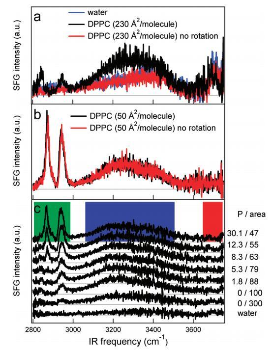圖5。(a)DPPC在水上以230?2/分子(黑色)和不旋轉(zhuǎn)(紅色)槽的SSP極化的SFG光譜。樣品以這樣的方式旋轉(zhuǎn):在激光焦點處,樣品以~0.06 m/s。不旋轉(zhuǎn)時,光譜與水相同?空中接口(藍(lán)色)。(b)在高密度(每個分子50?2)下,旋轉(zhuǎn)(黑色)和非旋轉(zhuǎn)(紅色)之間沒有區(qū)別。(c)裸露水面的SFG光譜(SSP極化)(底部光譜)和密度增加的水中DPPC的SFG光譜。壓力(mN/m)和每個分子的面積(?2)分別從底部到頂部增加和減少,在圖表旁邊給出。每個分子的面積由氯仿溶液滴的數(shù)量控制。彩色方塊標(biāo)記了圖6中使用的積分區(qū)域。本實驗中使用了相對較低的紅外注量(1.5 mJ/cm2)。