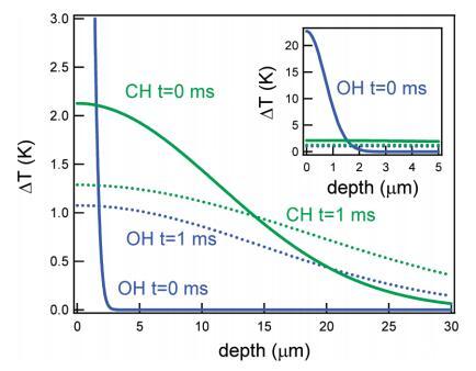 圖9。對于與CH(綠色)或OH(藍(lán)色)振動共振的紅外光束,溫度隨著進(jìn)入水層的深度而升高。實線和虛線分別表示t=0和t=1 ms。插圖顯示了相同的圖形,但帶有擴(kuò)展的yaxis。