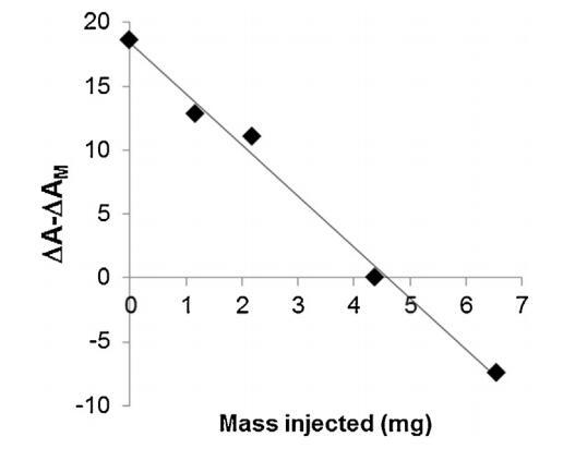 脂質體(不同濃度)對BSP蛋白的作用也如圖5所示。脂質體在進入亞階段前與精漿接觸。隨著脂質體中濃度的增加(曲線M/SP+C1至C4),BSP蛋白吸附引起的表面積增加逐漸延遲并減少。當含量達到4.37 mg(C3)時,界面上仍有少量BSP蛋白摻入,1600 s時出現(xiàn)肩部。在最高濃度(C4)下,未觀察到BSP蛋白摻入,分子面積的變化甚至比對照曲線更負,表明膜組分在亞相中輕微溶解。因此,脂質體作用于BSP蛋白的方式與LDL相同。最有趣的比例似乎介于C3和C4之間。根據(jù)確定面積變化與脂質體注射磷脂質量之間相互作用的曲線計算得出(圖6)。注射26.6 mg BSP的最佳質量為4.6 mg,即PC:BSP比為0.16(w/w)。