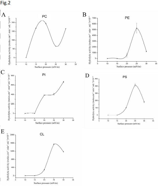 圖2示出了使用各種磷脂作為水解底物獲得的詳細活性-表面壓力曲線。可以看出,酶的水解活性高度依賴于表面壓力。然而,每種底物的活性曲線不同。發(fā)現(xiàn)基板PE、PS和CL的鐘形曲線具有特征性的最佳表面壓力值(圖2B、D、E)。在低于15 mN/m的表面壓力下,未檢測到基本酶活性。水解活性隨表面壓力的增加而增加。在25 mN/m的表面壓力下,觀察到PE、PS和CL的最大活性。然而,當表面壓力高于25 mN/m時,所有這些磷脂的水解活性降低。與所有測試的底物相比,在25 mN/m的表面壓力下,PE的水解率最高,水解活性達到5272.31×10-11摩爾。cm-2。最小-1。mL-1。對于PI,在15 mN/m以下也沒有觀察到水解速率,但是,沒有觀察到鐘形曲線,并且隨著表面壓力從15 mN/m增加到30 mN/m,活性增強(圖2C)。對于PC,從10 mN/m到25 mN/m觀察到鐘形曲線,但在30 mN/m的表面壓力下,活性進一步增加。隨著表面壓力從25 mN/m增加到30 mN/m,表面輪廓上的單層構(gòu)象可能發(fā)生了變化,導(dǎo)致活性增加。在本實驗中,在測試的表面壓力范圍內(nèi),SM沒有活性。從π-A曲線可以看出,在25 mN/m的表面壓力下測試的所有磷脂都處于液態(tài)冷凝狀態(tài),沒有達到各自的坍塌壓力。在這種情況下,超卵磷脂酶對不同單分子磷脂膜的偏好順序為PE>CL>PS>PI>PC。在這些條件下,SM沒有活性。Lecitase Ultra選擇性的詳細機制仍需闡明。