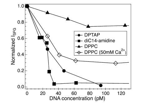 圖7(上圖)所示的壓縮等溫線清楚地表明,DNA對diC14氨基單層膜的影響,在很大的密度范圍內(nèi),是增加表面壓力,或等效地降低表面張力。也就是說,加入DNA后,表面生成的自由能總是變得更有利。然而,在沒有進一步信息的情況下,這些實驗幾乎無法深入了解表面熱力學變化的分子基礎。雙14-氨基單分子膜的CH區(qū)域的VSF光譜作為DNA濃度的函數(shù),以及由此產(chǎn)生的CH3SS/CH2 SS比率,提供了這樣的見解。如圖7(下圖)所示,向亞相添加DNA,即使在40 pM以下的體積濃度下,也會導致脂質(zhì)尾部順序的強烈增加。在解釋電子自旋共振研究的結果時,貝納蒂及其同事曾認為,吸附的DNA使凝膠相雙氰胺雙層(低于23°C)流態(tài)化,并使液相雙層(高于23°C)僵化,從而有效地平滑了在沒有DNA的情況下急劇的熱相變。91我們的光學和壓力等溫線測量都是在略低于熔融溫度的情況下進行的。我們的壓縮等溫線表明,DNA的作用是增加表面上單個鏈之間的相互作用(降低表面張力),而光學測量表明,鏈相互作用的增加導致脂質(zhì)尾部更有序。有趣的是,這些結果與這樣一種情況是一致的,即DNA的加入似乎會產(chǎn)生脂質(zhì),兩者之間的相互作用比沒有DNA時更強烈,尾巴比沒有DNA時更有序,鏈的流動性增強。這種脂鏈流動性和脂鏈順序的解耦類似于之前觀察到的膽固醇和DPPC混合物隨溫度變化的情況。92