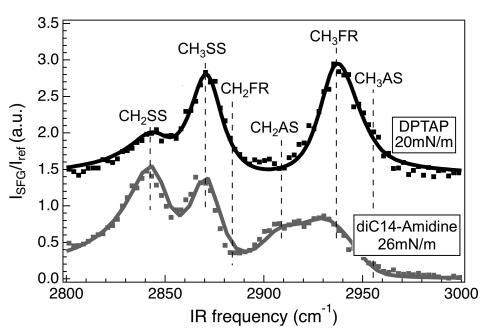 圖6。diC14 amdine在26 mN/m(灰色)下的SFG光譜(點)和DPTAP(黑色)在20 mN/m下的SFG光譜(點)。垂直線表示亞甲基對稱拉伸(CH2SS)、甲基對稱拉伸(CH3SS)、亞甲基非對稱拉伸費米共振(CH2FR)、亞甲基非對稱拉伸(CH2AS)的位置,甲基對稱拉伸費米共振(CH3FR)和甲基不對稱拉伸(CH3AS)。為清晰起見,DPTAP頻譜偏移。實體曲線使用洛倫茲模型擬合數(shù)據(jù)。