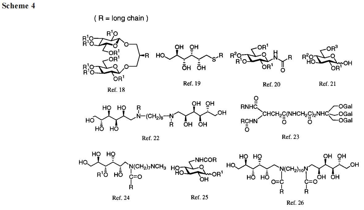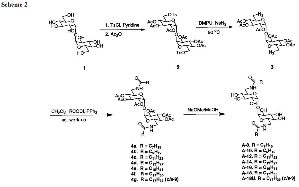 我們的第一個(gè)驚喜是發(fā)現(xiàn)A系列海藻糖雙子座不溶于水。例如,A-12、A-14和A-16(指鏈長(zhǎng)的數(shù)字)在1毫升溫水中旋轉(zhuǎn)2毫克時(shí)會(huì)留下沉淀物。即使在70°C的溫度下,A-10也會(huì)在這種處理過(guò)程中形成渾濁的懸浮液。A-8在室溫下的可溶濃度僅為1-2 mM(根據(jù)動(dòng)態(tài)光散射,在該濃度下,會(huì)形成膠束大小的聚集體)。天真地說(shuō),人們可能會(huì)認(rèn)為a-8的溶解度大得多,因?yàn)樵摲肿佑闪鶄€(gè)羥基和兩個(gè)酰胺組成。盡管相關(guān)的6-氨基-6-脫氧己糖衍生物需要加熱才能溶解,25許多烷基化單糖(例如,辛基葡萄糖苷和甲基6-O-(N-庚基羰基)-R-D-吡喃葡萄糖苷或下面的“Hecameg”)是水溶性的。然而,A-8并沒(méi)有類(lèi)似的天賦。這里的教訓(xùn)是,用一句老生常談的話來(lái)說(shuō),我們的雙子座比其各個(gè)部分的總和要多(或少)。不管老生常談與否,雙子座的獨(dú)特屬性都取決于它。