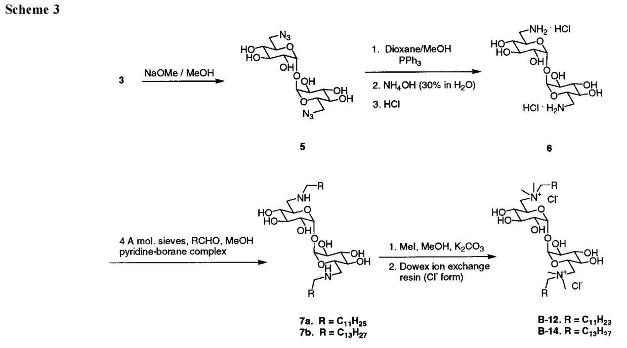 方案2和方案3以及實(shí)驗(yàn)部分詳述了我們獲得A系列和B系列海藻糖雙子的方法。另外幾條評(píng)論有助于美化這一信息。B型海藻糖雙子最明顯的先驗(yàn)途徑是用長(zhǎng)鏈?zhǔn)灏分苯尤〈?的甲苯磺?;鶊F(tuán)。盡管沿著這些路線進(jìn)行了多次嘗試,但只獲得了分解產(chǎn)物或起始材料。然而,如方案2所示,我們成功地用疊氮化合物取代了2的兩個(gè)甲苯磺?;?,得到了3。此處采用文獻(xiàn)程序28,但出于安全考慮,HMPA被DMPU取代作為溶劑。然后,雙疊氮化物3經(jīng)過(guò)Staudinger反應(yīng)25,29,在一個(gè)步驟中得到長(zhǎng)鏈雙酰胺4a-g,而該長(zhǎng)鏈雙酰胺4a-g只需脫保護(hù)即可獲得a系列雙子。在方案3中,脫保護(hù)糖5的疊氮化物還原將化合物轉(zhuǎn)化為二伯胺鹽酸鹽6。長(zhǎng)鏈醛與6和吡啶硼烷絡(luò)合物30的還原胺化得到海藻糖衍生物7。使用NaBH3-CN作為還原劑,該反應(yīng)的產(chǎn)率很低。在用甲基碘化物將7甲基化,然后進(jìn)行離子交換(以促進(jìn)純化和提高溶解性)之后,我們得到了B系列海藻糖雙子。