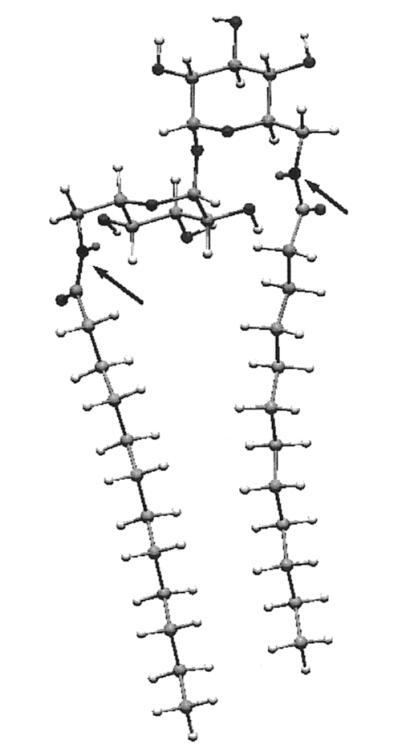 計(jì)算首先將海藻糖插入宏模型程序42,并對(duì)結(jié)構(gòu)進(jìn)行琥珀色能量最小化。從使用琥珀色*力場(chǎng)的25000個(gè)構(gòu)象搜索中,我們選擇了能量最低的構(gòu)象,該構(gòu)象恰好與報(bào)告的X射線結(jié)構(gòu)重疊。43,44接下來(lái),該結(jié)構(gòu)中的6-和6′-羥基被乙酰氨基取代。在模擬的水環(huán)境中,用AMBER*再次進(jìn)行了25000次構(gòu)象搜索。然后乙?;皇榛〈?,然后對(duì)生成的a-12雙子座進(jìn)行了另一次搜索。結(jié)果表明,整個(gè)構(gòu)象由酰胺羰基和相鄰葡萄糖環(huán)的2-羥基之間的兩個(gè)分子內(nèi)氫鍵控制。氫鍵導(dǎo)致兩條全反式鏈彼此擺動(dòng)約95°。A-12的固態(tài)紅外光譜證實(shí)了這種相互作用,該光譜顯示1646 cm-1處有羰基帶,而Hecameg的羰基帶為1700 cm-1,單體葡萄糖類(lèi)似物的羰基帶為1698 cm-1。25由于這種構(gòu)象會(huì)不切實(shí)際地排除分子內(nèi)疏水締合,而且在任何情況下,羰基氫鍵位點(diǎn)的溶劑可能會(huì)淹沒(méi)在水中,我們故意不允許-CdO氫鍵,并重新計(jì)算。通過(guò)這種方式,我們得到了圖6??梢钥吹?,一條鏈上大約有八個(gè)碳與其伙伴鏈的碳并排排列。N/N距離僅為7.4?,整體分子形狀為“管狀”。用另一種方式說(shuō),糖的頭基延伸的距離不比兩條鏈的寬度大多少,就像人們預(yù)期的一種易于堆積成雙層的化合物那樣。45因此,正如前面從實(shí)驗(yàn)數(shù)據(jù)得出的結(jié)論,海藻糖更像是一個(gè)統(tǒng)一的頭基,而不是一個(gè)可以有效隔離鏈的長(zhǎng)間隔基。