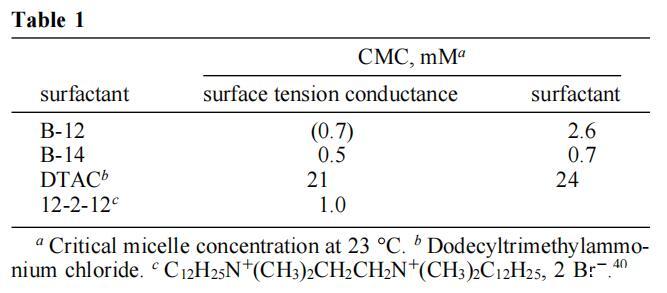 B-12和B-14確實(shí)是水溶性化合物,在臨界膠束濃度(CMC)以上形成膠束,動(dòng)態(tài)光散射顯示顆粒大小小于5nm。CMC值是通過(guò)表面張力-濃度曲線(圖4)和電導(dǎo)率-濃度曲線(圖5)中的斷裂來(lái)確定的。38表1給出了結(jié)果數(shù)據(jù)(以及兩種常規(guī)表面活性劑的數(shù)據(jù),用于比較)。如圖所示,B-12的CMC值通過(guò)張力測(cè)量法和電導(dǎo)測(cè)量法(這兩種方法都是可重復(fù)的)得出的結(jié)果不一致。這種差異至少部分可以追溯到B-12表面張力的時(shí)間依賴(lài)性。因此,在10分鐘的過(guò)程中,B-12水溶液的表面壓力增加了10 mN/m,之后趨于穩(wěn)定。這種動(dòng)態(tài)表面張力過(guò)程(之前已經(jīng)用雙子座表面活性劑觀察到)13,15,39可能與雙子座表面活性劑在空氣/水界面組織方面的困難有關(guān)。為了解決這個(gè)問(wèn)題,圖4中的B-12溶液在表面張力測(cè)量之前老化20分鐘,從而減少了系統(tǒng)尚未平衡的可能性。盡管采取了這種預(yù)防措施,但我們無(wú)法確定依賴(lài)時(shí)間的界面重組是否不會(huì)影響B(tài)-12圖,并導(dǎo)致基于張量和電導(dǎo)的數(shù)據(jù)之間的差異。當(dāng)然,后者來(lái)源于不受界面事件影響的大塊特性,因此更可靠。有趣的是,B-14沒(méi)有表現(xiàn)出隨時(shí)間變化的表面張力,兩種方法確定的CMC值是合理一致的。也許更長(zhǎng)的鏈既增強(qiáng)了對(duì)空氣/水界面的親和力,也增強(qiáng)了從溶液中吸收界面的動(dòng)力學(xué)。