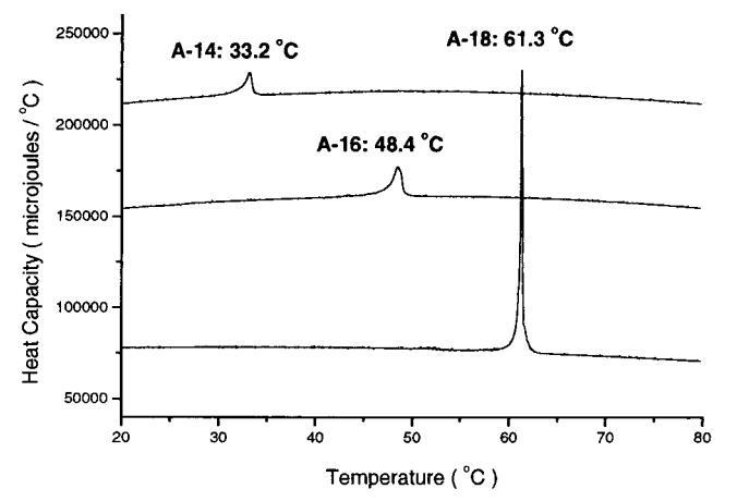 圖3。通過(guò)差示掃描量熱法(DSC)在10°C/h的加熱速率下獲得的雙子座A-14、A-16和A-18的2 mg/mL懸浮液的吸熱峰。