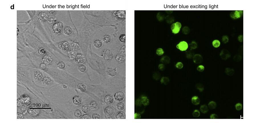 然后,我們進(jìn)一步評估了基于體外共培養(yǎng)系統(tǒng)的細(xì)胞選擇性,該系統(tǒng)包含HL60癌細(xì)胞和HDFa原代細(xì)胞,它們與體內(nèi)環(huán)境非常相似[8]。將最終濃度為20 mM的FITC-G(IIKK)3I-NH2添加到系統(tǒng)中,培養(yǎng)1 h后,用熒光顯微鏡觀察兩種細(xì)胞中的肽分布(圖1d)。很明顯,綠色熒光集中在懸浮和圓形HL60細(xì)胞中,而不是粘附和紡錘形HDFa細(xì)胞中,這再次表明肽具有良好的細(xì)胞選擇性,以及對癌細(xì)胞的快速識別。