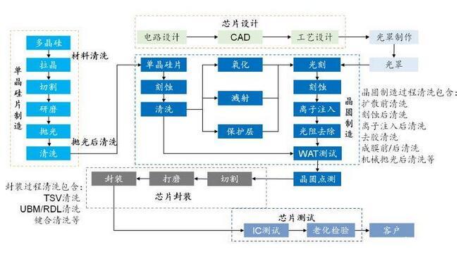 芯片制造技術(shù)的進步驅(qū)動半導(dǎo)體清洗技術(shù)快速發(fā)展。在單晶硅片制造中,光刻,刻蝕,沉積等工藝后均設(shè)置了清洗工藝,清洗工藝在芯片制造進程中占比最大,隨著芯片技術(shù)節(jié)點不斷提升,對晶圓表面污染物的控制要求也越來越高。