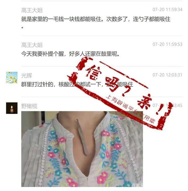 近日,多條“做完核酸檢測(cè)身體變磁鐵”的消息在微信群中流傳,有人稱廣東一女子做完核酸檢測(cè)一個(gè)星期之內(nèi),身體吸住了金屬!根據(jù)這些消息,有人稱“以后不要再做核酸檢測(cè)了,越做身上‘磁’越多”,甚至有人號(hào)召大家拒絕做核酸檢測(cè)。