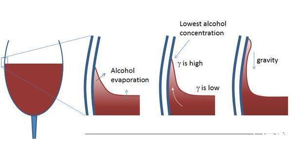 瑪拉高尼效應(yīng)不光存在于物理實(shí)驗(yàn)和我們之前開(kāi)的玩笑之中,在我們的日常生活中也有馬拉高尼效應(yīng)的體現(xiàn),這一現(xiàn)象可能每一個(gè)人都見(jiàn)過(guò),那么就是我們?cè)诤染频倪^(guò)程中看到的所謂的好酒會(huì)掛壁的現(xiàn)象。就算再好的酒,它也是有水在其中的。好酒中的酒精由于毛細(xì)效應(yīng)爬到高處的時(shí)候,酒精蒸發(fā),使得處于上層的酒液的酒精含量相比較于下層來(lái)說(shuō)要低,而同時(shí)的酒的表面張力要比水小,兩種液體表面張力的差距就形成了馬拉高尼效應(yīng)。