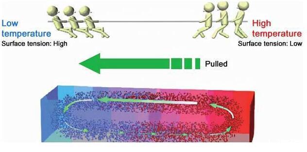 在兩種液體相互接觸的時(shí)候,表面張力強(qiáng)的液體會(huì)將表面張力弱的液體拉過(guò)來(lái),這股力會(huì)將表面張力弱的液體反向倒吸進(jìn)表面張力強(qiáng)的液體之中,科學(xué)家將這一現(xiàn)象命名為馬拉高尼效應(yīng)。導(dǎo)致這一現(xiàn)象發(fā)生的條件有很多,比如液體的濃度含量,溫度的高低都會(huì)讓兩種液體產(chǎn)生馬拉高尼效應(yīng)。