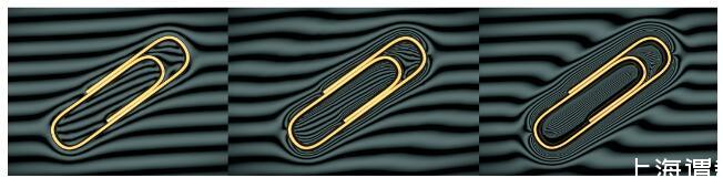 在這個(gè)例子中我們成功使密度大于水的回形針漂浮在水面上,水面下面的條狀背景會(huì)因?yàn)樗娴膹澢冃?,從左到右回形針的密度逐漸增大,中間條紋的密度也在逐漸增加。在最右邊的場景中,回形針的密度達(dá)到了7.9 g/cm^3(金屬鐵的密度),是水密度的將近8倍,但是依然可以依靠表面張力漂浮起來,得到的條紋分布與真實(shí)圖片最為接近。