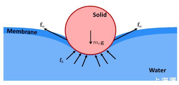 其中是流體表面的面積,稱為表面張力系數(shù)。當(dāng)流體與固體發(fā)生作用時(shí),流體表面的分子同時(shí)會(huì)受到固體分子的作用,從而將表面張力作用在固體上。固體根據(jù)表面特性不同可以分為親水和疏水兩類,疏水材質(zhì)在水面上會(huì)受到向上的表面張力作用,對于一些細(xì)小的結(jié)構(gòu)來說這個(gè)力要比浮力更為明顯。比如說水黽是一種可以生活在水面上的昆蟲,它的腳非常細(xì)長,并且有很多絨毛來保持疏水特性,因而水黽可以依靠表面張力維持自身的重量,并通過腳來劃動(dòng)水面來向前運(yùn)動(dòng)甚至跳起。