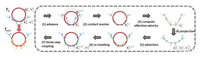 我們的耦合系統(tǒng)分為三個(gè)部分:流體,表面層,固體。流體部分我們采用傳統(tǒng)的歐拉網(wǎng)格的模擬方法,在交錯(cuò)網(wǎng)格(Staggered Grid)上用算符分離的方法求解離散不可壓的Navier Stokes方程。固體部分采用傳統(tǒng)的拉格朗日方法求解牛頓方程。我們的主要貢獻(xiàn)在于在流體與固體之間插入了一層有質(zhì)量、有厚度的流體表面層,這個(gè)表面層直接對應(yīng)我們上面介紹的流體表面分子稀疏的部分。因?yàn)檫@個(gè)表面層非常薄,我們可以使用帶虛擬厚度的單層三角網(wǎng)格來表示,然后在這個(gè)表面層上施加表面張力勢能。為了將這三個(gè)部分耦合起來,我們在表面層和背景網(wǎng)格、固體和背景網(wǎng)格之間定義了速度的插值矩陣,同時(shí)將流體的壓強(qiáng)作用在表面層和固體上,以及將表面張力作用在固體上,這樣我們將這三部分寫進(jìn)一個(gè)三相耦合方程里進(jìn)行統(tǒng)一求解和更新。最終我們算法的流程如下: